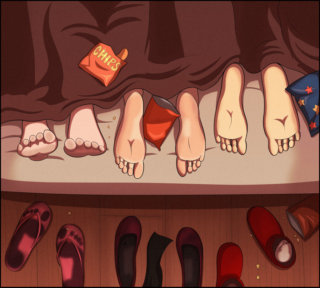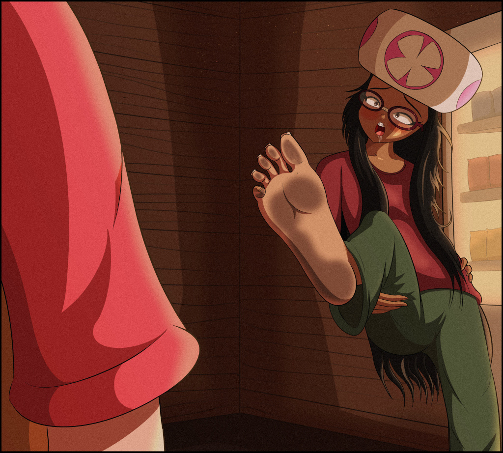 | In Amini’s room, she finished tidying the kitchen. Penelope and Jasmin were lying in the same bed. Penelope’s eyes were half-open and fixed on the ceiling, while Jasmin was curled up on her side and softly snoring. They look like angels, Amini thought. I would’ve never guessed what they’ve been through. She turned off the faucet and walked to the front door to check the lock. Sighing with relief, she slipped out of her open-backed clogs. Penelope’s eyes darted towards her. Amini’s tanned feet hit the floor with a soft slap, sticking slightly to the wood as she crossed the room. “Make sure you get some rest, Penelope.” She stopped just short of the bed. “I promise you don’t have anything to worry about.” Penelope didn’t respond. Her eyes lowered to Amini’s feet; they were skinnier than Minh’s, had bare toenails and were smaller overall. After a moment, she looked back at the ceiling. Amini resisted the urge to stroke her forehead. Signs of affection just aren’t allowed right now. “We’ll have a good time together,” she whispered, heading to the bathroom. Penelope waited until she heard the shower running. She looked at Jasmin. I won’t touch her, she promised herself. It’s wrong. I’m the princess’ daughter; Mother and Miss Toadette would both expect better of me. Then she was up, drifting to the clogs. After all, they weren’t alive. She knelt and sniffed them wildly, letting out a shuddering moan. They reeked of pungent, sweaty feet mixed with pinewood and spice. Nowhere near too stinky like Miss Toadette’s flats. At least I’ll have these to keep me sane. As well as… She moved to Jasmin’s sandals next. The imprints of her feet were burnt into the material. Penelope picked the left one up; it was still warm and reeked as godawfully as it had at the convention. A twisted smile grew on her face. Sorry, Miss Toadette, but Jazz’s smell is just… She brought the heel of the sandal to her lips. Gulping, she dragged her tongue slowly up the length of the shoe, all the way to the toe indentations. It tasted foul. The surface was initially rough, but as her tongue pressed harder, it morphed into this creamy sensation. A thick film of sweat, dust and grime coated the sandal, dissolving on her tongue. It made her eye twitch. She spat the dust out onto the floor. But she wasn’t stopping her taste test. Her tongue went up and down the shoe repeatedly; she would refuse to swallow anything, letting it collect on her tongue before she wiped it on her shirt sleeve. Disgusting as the bits of grime were, the initial taste had her captive. This is so buttery! Sucks I gotta wipe these crumbs off, but wow, is it worth it! After planting kisses on the sandal, she dropped it onto the floor. With a heavy sigh, she crawled to the bed and took hold of the sheets. I have to do it, Jazz! Forgive me. Off the sheets came. Jasmin’s feet were pointed sideways. To her surprise, they were beyond filthy. Did she shower? Or did she keep the water on and pretend she was showering? Penelope’s breathing got deeper as she stared. They’re so…icky. But it’s… Oh, Jazz… She lowered her face and inhaled. The mixture of cheese and sweat was far more potent than Amini’s. It was intoxicating. She shot out her tongue, but it slowed as she focused on the space between Jasmin’s largest toes. A dark line lingered there. Toe jam. Penelope gagged on instinct at the foreign texture. Yet she refused to pull away. Instead, she moaned into the foot, scooping the substance out with the tip of her tongue. Its taste was indescribably earthy as it dominated her taste buds. Okay, this is nasty, she thought, panting. So, so nasty! But I can’t just spit it out. I… I want to clean her feet. She deserves it. She swallowed the jam, feeling it slide down her throat. Immediately she went back for more. Her hand drifted between her legs again, rubbing even stronger. However, she kept an ear open for the bathroom door. The danger of Amini walking out at any second sent a chill down her spine. Jasmin’s toes twitched against her lips. Penelope’s eyes widened. Once she heard Jasmin’s soft snoring return, she could breathe a sigh of relief. She sucked harder and faster, treating the toes as if they were lollipops. Her whimpering grew as she milked the stale grime from the crevices. Each dive into hot toe jam made her pussy quiver. I gotta stop soon… Gotta stop… Groaning, she sucked on Jasmin’s index toe intensely. Just a little longer… Just a little— The climax snuck up on her. She gasped, her face getting lower into Jasmin’s feet as her body spasmed. Her legs crushed her hand between her thighs as juice flowed. While her body shuddered, the toe remained twitching in her mouth. She had to fight every urge to scream in delight. The sensation ended within the minute, but it left her drenched in sweat. Her heart beat so fast that she thought it would jump out of her chest. Jasmin’s toes were now glistening. Penelope wiped her mouth, sighing. The weird, sour taste of raw toe jam still peppered her tongue. It was revolting; this was the grossest thing she’d ever done. And yet she couldn’t stop blushing. She got under the sheets. Jasmin rolled over, now facing her. Penelope smiled wearily and moved closer until their feet touched. “You’re amazing,” she whispered, wrapping an arm around Jasmin and pulling them together. “Night, Jazz.” Who knows? The stay here might not be so bad, especially when I’ve got you. When Amini emerged, both girls were dead to the world. She prepared to shut the lights off when she noticed something: the shoes at the front door weren’t lined up properly. I could’ve sworn I’d lined them up, she thought. She nudged her clogs back into place and reached for Jasmin’s left sandal. As her fingers grasped the sole, she recoiled. Her fingers returned soaked. She let out a groan of disgust. She touched the insole again cautiously. I