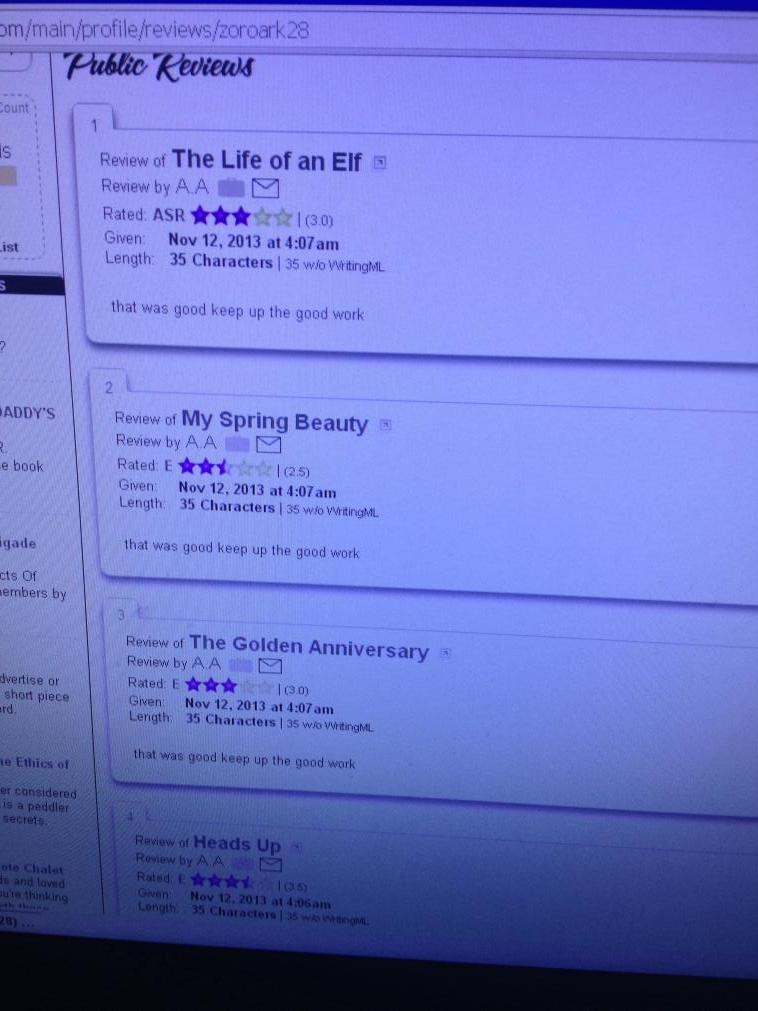 Ok. If, IF I'm a moaner and a thin skinned proud stiff necked geezer who should cop it on the chin well take a squint at these photos. Review of my piece complete with rating, which in the greater scheme of things isn't the end of the world as we know it. All roight? Roight then. Then the bloke's (or blokess's) totally empty port, (there's no bio either) and a bunch of reviews done one after the other with a cookie cutter cloning system.