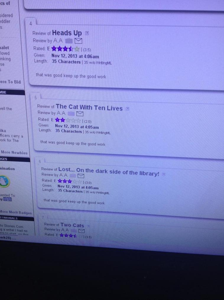 But, you know, it occurs to me, maybe they do. Maybe they know MANY PEOPLE on here. On WDC. Maybe these persons who make a fake account in five minutes know exactly what they're doing. Because they're someone who's a regular on here. They are someone who knows their way around this site, knows how it works, and knows just what would get under someone's skin. They also know just how to get away with it. The ratings are...wellll almost ok.