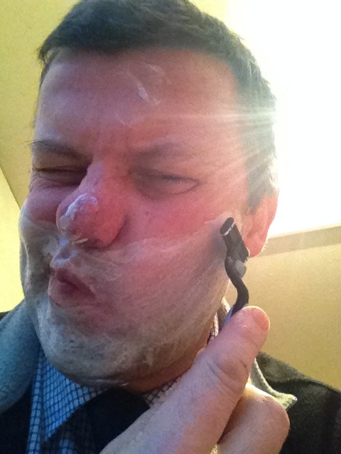 Our current yesteryear retro 1600's-1930's bathroom facilities with a modern razor to balance out the inconvenience. Note the tie - just like Colin Furse wears in his engineering workshop.