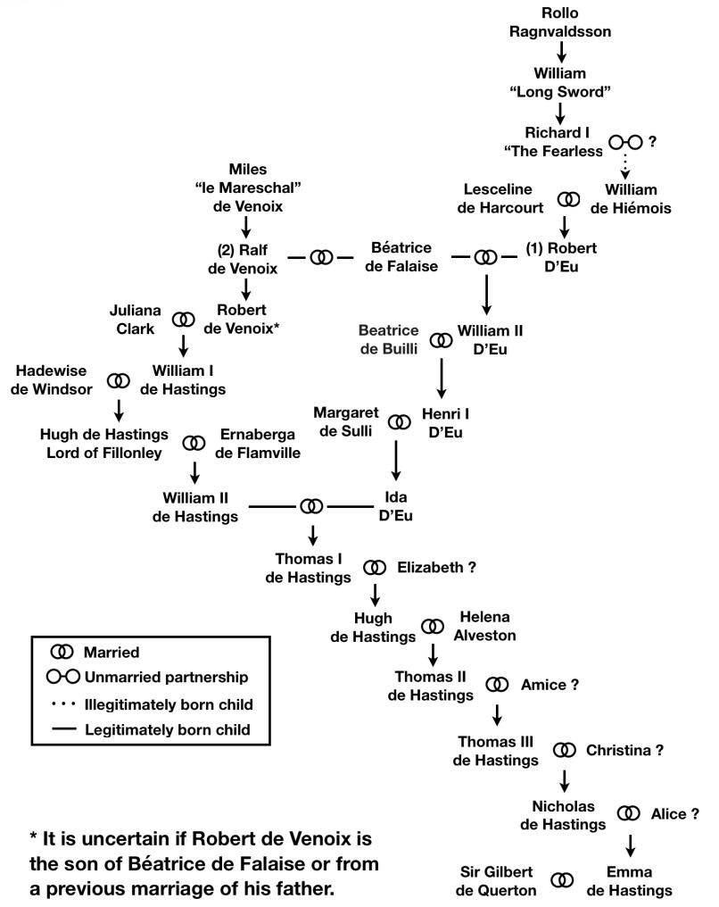 While Gilbert was quite capable of making a name for himself, he also married well. About 1280, he married Emma de Hastings, the heiress of one of the most illustrious families in all of England. From her father, they inherited Croglin, Nateby, and Tebay, though they lived at Lammerside Castle. Emma was my 20th great-grandmother and the 11th great-granddaughter of "Rollo" Ragnvaldsson, the first Duke of Normandy, albeit through an illegitimate child of his grandson, Richard I (Figure 4).