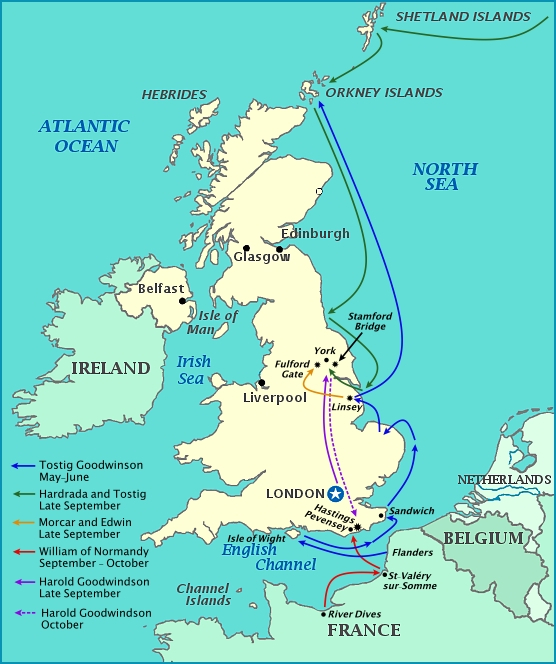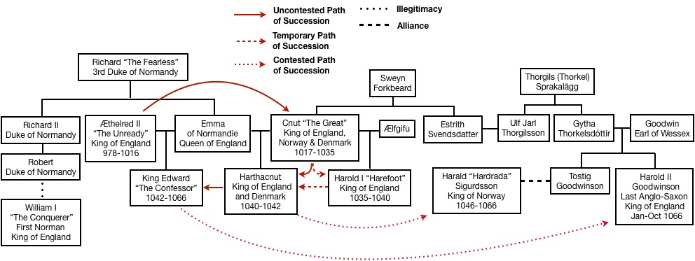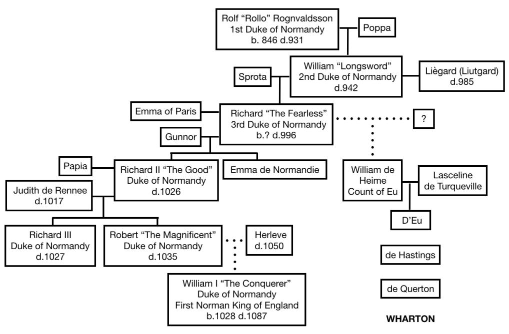 A central character in the first five years of the Vikings television program mentioned in the chapter on Angry Anglos and Dastardly Danes, was a man named Rollo Sigurdsson, supposed brother of Ragnar Lothbroke. Many liberties were taken regarding his history for the sake of entertainment, but the fact remains there was a Viking named Rollo and he did become the first Duke of Normandy. We are descended from him. Our ancestor's full name was Rolf "Rollo" Ragnvaldsson. Rolf is from the Old Norse Hrólfr (English Rudolph or Ralph). I suspect Rolf is equivalent to Rudolf and Rollo is more equivalent to Rudy. Norse surnames took the name of their father, so Rollo was the son of Ragnvald, sometimes spelled Rögnvald (English Ragnall). Rollo was also known as Ganger-Hrólfr, meaning "Walking Rolf"—so named because he was so large that no horse could carry him. He conquered the region of northern France that became Normandy, named for the Normans ("Northmen"), and became the first ruler of Normandy. Scandinavian Rulers The Viking line of Rollo Ragnvaldsson is the oldest I've been able to trace back. The progenitor was Fornjót, King of Kvenland. This region, also called Cwenaland, is a difficult area to pin down because there are many conflicting ancient accounts, as well as some discrepancies with the compasses used by the Vikings. However, most experts now agree it included the northern portion of Finland, probably northeast of the Gulf of Bothnia, and possibly even part of northern Sweden. The Kvens (Cwenas) often crossed the northern mountains of modern Sweden and Norway to attack the Northmen there. They used small and light, portable boats to travel over land and across the numerous mountain lakes called meres. Even though Kvenland is thought to have existed, these earlier ancestors may have been more myth than reality. Fornnjót was called "The Ancient Giant" and his sons were Hiér (meaning "sea"), Logi (meaning "fire"), and Kári (meaning "wind"). Kári's son was Frosti (called the "Father of Frost") and his grandson was Snær (called the "Father of Snow"). All of this comes from an ancient document called The Orkneyinga Saga. [1] It sounds almost like the stuff of myths and legends and may well be just that, but it's interesting nonetheless. That line that descends to Rollo Ragnvaldsson is as follows: 1 Fornjót (b.abt.160), King of Kvenland 2 Kari Fornjótsson (b.abt.189), King of Kvenland 3 Frosti (or Jøkull) Karasson (b.abt.240), King of Kvenland 4 Snaer den Gamle (b.bet.245-286), King of Kvenland ▶︎ 5 Thorri Snærsson (b.bet.266-326), King of Kvenland 6 Gor Thorasson (b.bet.342-402), Sea King ▶︎ 7 Heytir Gorrsson (b.abt.509), Sea King 8 Svidri Heytirsson (b.bet.514-574), Sea King 9 Sveidi Svidrisson (b.abt.649), Sea King 10Halfdan den Gamle Sveidasson (b.bet.715-755) ▶︎ 11 Ivar Halfdansson (b.abt.780), Earl of Upland, Norway 12 Eystein Glumra "The Clatterer (noisy)" Ivarsson (b.abt.810), Earl of Upland and Hedemarken (area around Oslo) 13.1 Ragnvald Eysteinsson (b.825), Earl of Möre and Romsdal ▶︎ (1) from an unknown mistress: 14.1 Hallard Ragnvaldson ▶︎ 14.2 Hrollaug Ragnvaldson ☜ Our Ancestor ▶︎ 14.3 Einarr Ragnvaldson ▶︎ (2) from mariage to Ragnhild (Hilde) dau. Hrolf Nefjaa : 14.4 Ivar Ragnvaldson ▶︎ 14.5 Rollo Ragnvaldsson (b. abt. 846) ☜ Our Ancestor ▶︎ 14.6 Thorir Ragnvaldson ▶︎ 13.2 Sigurd Eysteinsson ▶︎ Rollo was the 14th descendent of Fornjót. While Rollo and his descendants are referred to as the Dukes of Normandy, that appears to be a case of revisionist history. Not until Richard II was the ruler of Normandy referred to as Duke. Before that, they used the title Count of the Normans, defying Norman pretensions to a ducal title. Although, Richard I was once called dux pyratorum, meaning "Leader of Pirates." In our family's case, the eponymous "Leader of the Pirates" may be more appropriate, because our connection can hardly be called noble—more like ignoble. Our ancestral D'Eu line that branches from the Dukes of Normandy are connected through illegitimacy (Figure 1). Rollo's son William, called William Longue Epâee "Long Sword," had a son named Richard Sans-Peur "The Fearless." It was this Richard that had at least two illegitimate sons and one daughter through an unknown mistress. The oldest son was Godfrey (or Geoffrey) and the younger son was our ancestor, named William de Hiémois (of Hiémois), a village in central Normandy. The name of Richard's mistress has been lost to history, but she must surely have held his interest to have borne him three children. While William de Hiémois may have been an illegitimate son of Richard, such designations carried little of the stigma during that time period that they began to later. In fact, Richard's relationship with William's unknown mother was called more danico. ▶︎The children of such marriages were in no way considered to be of maligned rank or disadvantaged with respect to inheritance. Many sons of more danico went on to become dukes or kings by succession or conquest. Such was the case with William de Hiémois who became the third Count de Eu. In 966, Richard created the county of Eu partially as a borderland to protect Normandy from an eastern invasion, and partially as an inheritance for his illegitimate sons (Figure 2). ▶︎ The oldest of Richard's illegitimate children, Geoffrey (or Godfrey), became the First Count D'Eu. He was followed by his son, Gilbert (or Giselbert). The title then passed to Richard's second son, William de Hiémois, who became the 3rd Count D'Eu. He was my 32nd great-grandfather. Five generations after William de Hiémois, Ida D'Eu married into the famous Hastings family when she married William de Hastings. And then, six generations later, Emma Hastings would marry into the Wharton familyr. Thus completed the connection from the Wharton family to the Norse Vikings through Rollo, first ruler of Normandy. William I, a 2nd great-gra