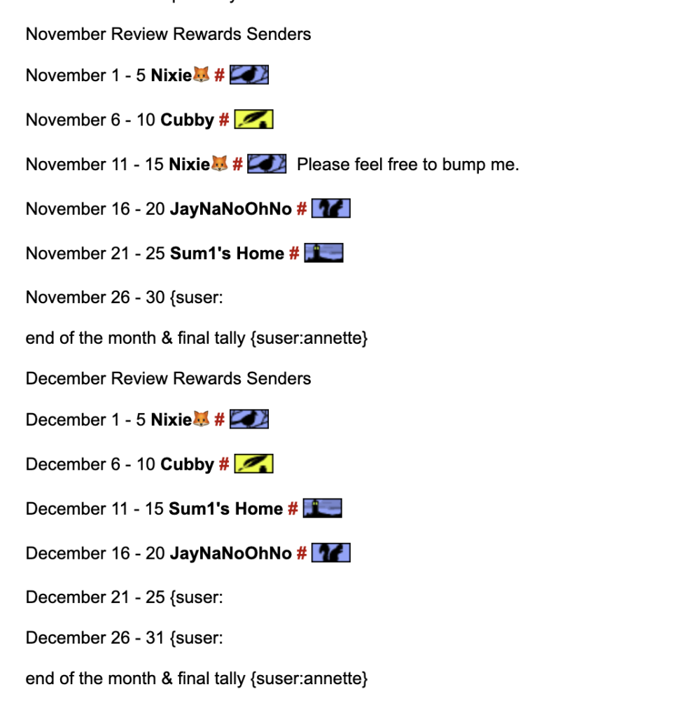 Greets, The broken suser tag on the line before is breaking it. ![]() Please take that out and make sure all the tags are matching and you'll see it works fine: IE: {suser:annette} = Annette There you can see you user tag works fine. It's your use of the tag with other broken ML. When you have an open brace somewhere before, the system is going to start trying to make sense of that as a tag and won't stop until it finds a closing brace. As such, any unclosed braces will lead to wild and unpredictable side effects. It's possible that some combinations with broken tags will work, but that's "accidental". You can only be sure to have working tags if you have all the braces and tags correct on the page. Instead of the broken open brace you could close it like this: {suser:} to keep track of the space... Or put it there with the double's closed. {{suser:}} Working example... Anniversary Reviews Team Crediting Schedule ▼ Best wishes, ~~SM