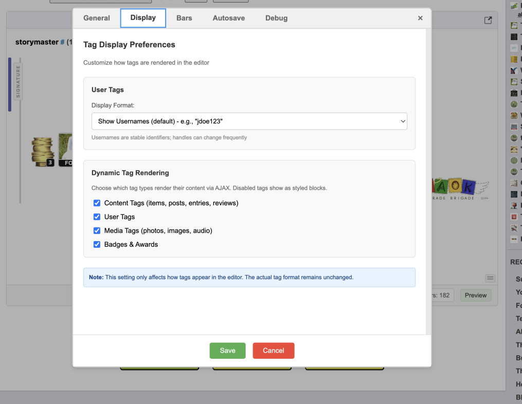 The new default for the editor is to show usernames instead of handles when converting to tags. In addition, the tag rendering is a more configurable setting in settings allowing username or handle display, as well as handling of rendered tags in sets. This would allow one to collaspe the larger tags, like images and photos, while keeping other more visually useful tags, like items and posts (where the title is generally more helpful than the number), rendering.