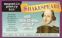 ![]() | Magnetic Poetry: Shakespeare Kit #1015 The Shakespeare Kit is a saucy collection of over 240 bard-inspired magnetic tiles. Your Price: $14.95 |